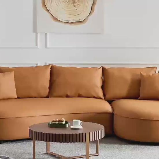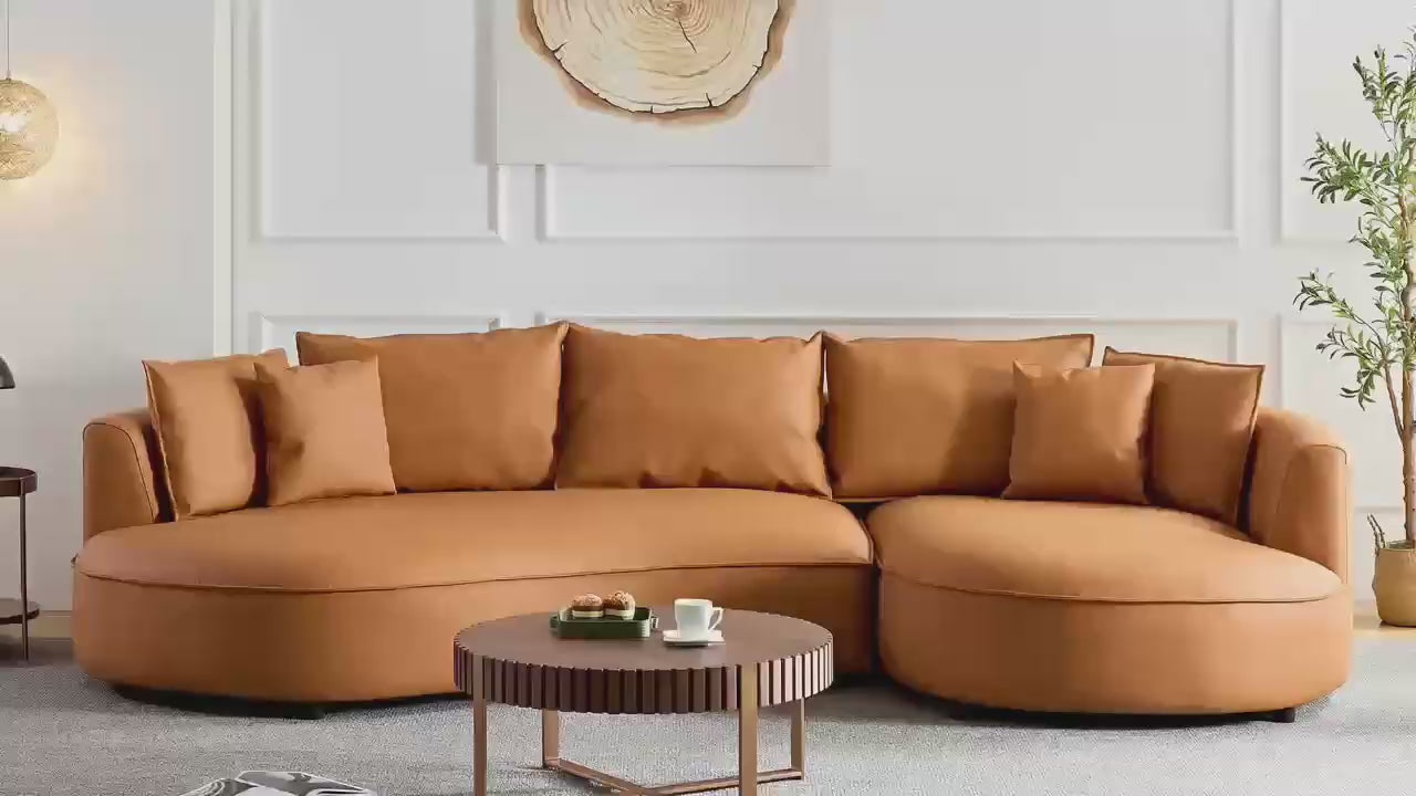 This modern curved sectional sofa features eco-leather upholstery and high-density foam cushions for lasting comfort.